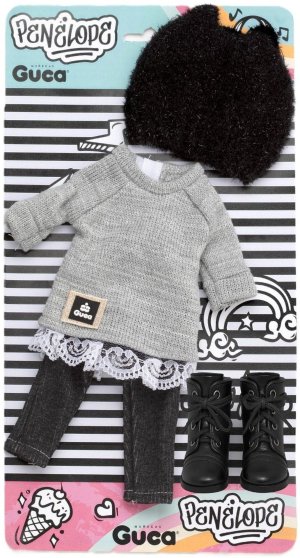 4dílný set: 3 kusy oblečení a botičky pro panenku Penelope velikosti 34 cm. Vyrobeno ručně ve Španělsku, baleno v igelitovém obalu na kartonové podložce. Doporučený věk od 3 let.