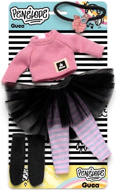 5dílný set: 4 kusy oblečení a ozdobná čelenka pro panenku Penelope velikosti 34 cm. Vyrobeno ručně ve Španělsku, baleno v igelitovém obalu na kartonové podložce. Doporučený věk od 3 let.