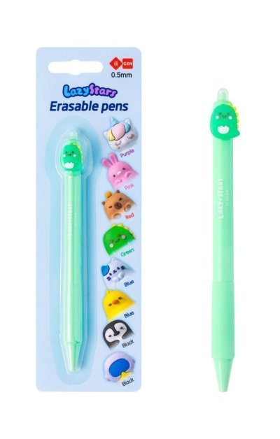 Klikací gumovací gelové pero s motivem Dinosaura. Tloušťka hrotu 0,5 mm, inkoust zelený, na blistr kartě.