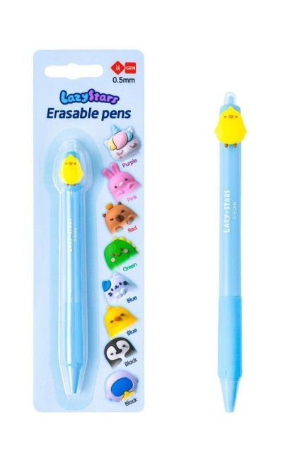 Klikací gumovací gelové pero s motivem Kačenky. Tloušťka hrotu 0,5 mm, inkoust modrý, na blistr kartě.