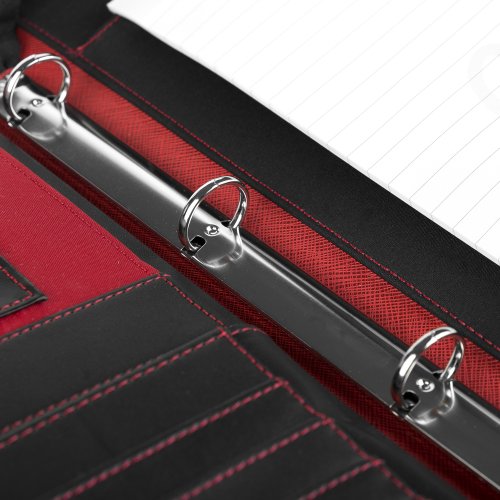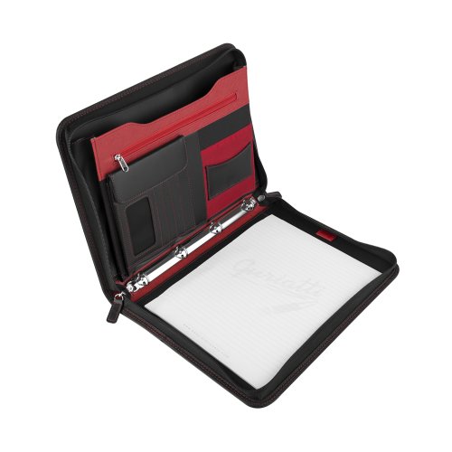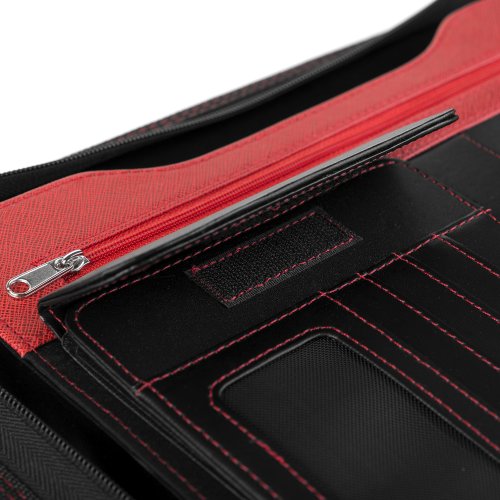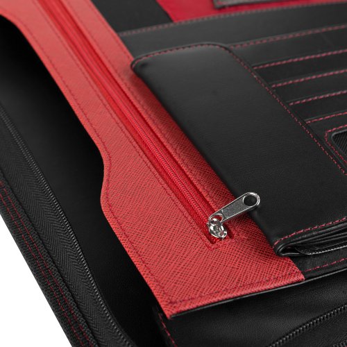 Tato diplomatka formátu A4 nabízí bohaté vybavení pro dokonalý přehled a organizaci dokumentů. Vnitřní prostor obsahuje 4kroužkový pořadač, který udrží vaše důležité papíry v pořádku. K tomu nechybí místo pro blok (blok je součástí balení), dvě velké kapsy na dokumenty a několik kapes pro vizitky, karty nebo drobnosti. Praktická kapsa na zip a kapsa na CD zajišťují bezpečné uložení vašich cenností.