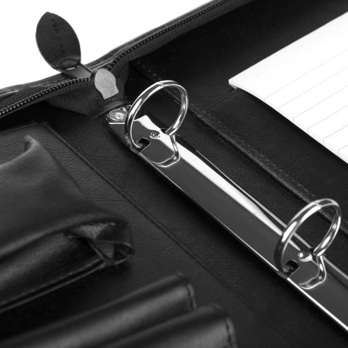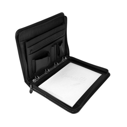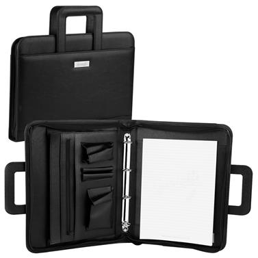 Diplomatka Safe vám pomůže mít všechny důležité věci přehledně uspořádané. Obsahuje prostor pro blok a psací potřeby, přihrádky na vizitky, kalkulačku nebo telefon, a navíc praktické kapsy na zip pro drobné příslušenství. Díky 4kroužkovému mechanismu snadno připevníte dokumenty a další komory vám umožní uložit katalog nebo knihu.