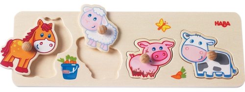 čtyři vkládací obrázky - koník, ovečka, kravička a prasátko úchytky jsou (stejně jako celý výrobek) z přírodního materiálu rozvíjí představivost, jemnou motoriku a prostorové vnímání