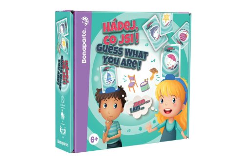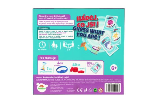 Zábavná společenská hra pro celou rodinu. Hra, která zaručeně rozesměje celou rodinu nebo partu přátel. Veselá hádací hra, při které si hráči nasazují čelenku s kartičkou a snaží se pomocí otázek uhodnout, kým nebo čím jsou. Formou hry si hráči osvojí také 80 anglických slovíček. Nasaď si čelenku, vyber si kartu a pomocí otázek, na které ti mohou spoluhráči odpovídat pouze ANO nebo NE, zjisti, co je na obrázku. Cílem hry je nasbírat co nejvíce žetonů za správné odpovědi v limitu přesýpacích hodin. Rozměry balení 23 x 21 x 6 cm. Vhodné pro děti od 6 let.