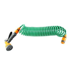 sada obsahuje: spirálová hadice, připojení ke kohoutku s rychlospojkou, rychlospojku a pistolový rozstřikovač