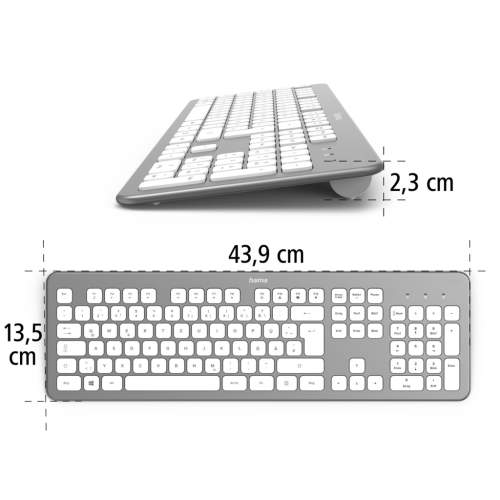 Bezdrátová klávesnice Hama KW-700, stříbrná/bílá elegantní tenká bezdrátová klávesnice pro zadávání údajů do PC nebo notebooku tlumená tlačítka umožňují tichou a nerušivou práci multimediální funkce …