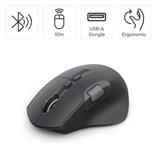 • 10tlačítková bezdrátová optická myš s volitelným připojením na tři zařízení: 1x bezdrátový USB přijímač a 2x Bluetooth