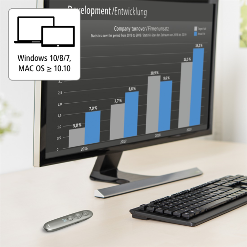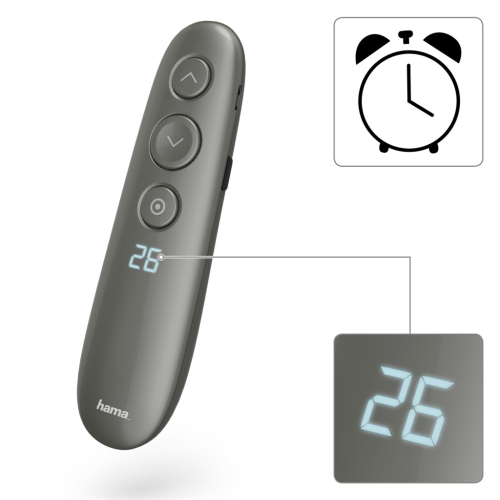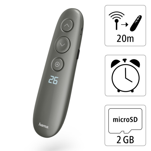 Hama bezdrátový ovladač prezentací s digitálními funkcemi pro rozšířené ovládání a podporu během prezentací, umožňuje ovládání dokumentů (listování/posouvání) MS Powerpoint a ostatních kancelářských …