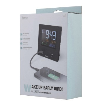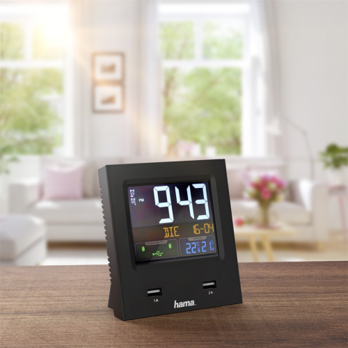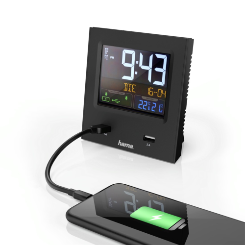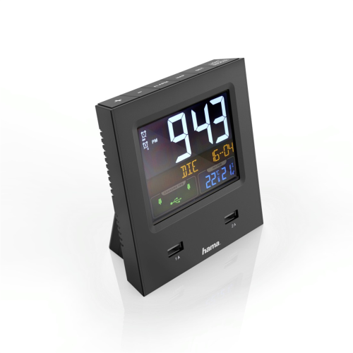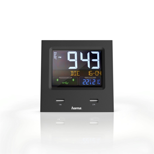 Hama Dual-USB, budík řízený rádiovým signálem, barevný displej, 2 USB konektory pro nabíjení