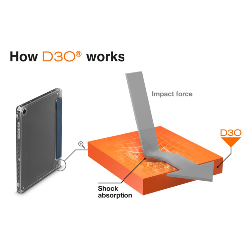 D3O® je unikátní inovativní materiál, který je téměř nezničitelný. Tento materiál zaručí i při minimální tloušťce krytu maximální ochranu zařízení při nárazech, pádech a úderech, a to dokonce i při pádu z výšky 3,5 m. Zároveň ale vůbec neovlivní používání a ovládání zařízení. Tvrdost 4H zaručuje mimořádnou odolnost vůči poškrábání. Díky použitým materiálům zůstane kryt stále čirý a nikde nezežloutne, jak se to stává u běžných krytů.