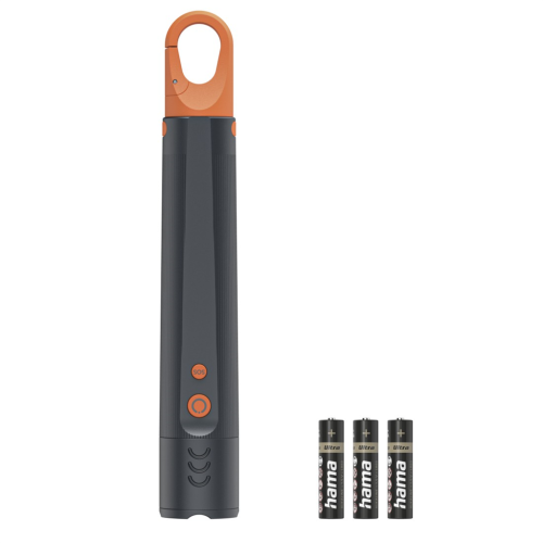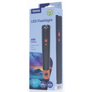 Hama FLX600, LED svítilna, hliníková, 600 lm / 250 m, 4 režimy+SOS, IP44, zoom, karabinka, baterie