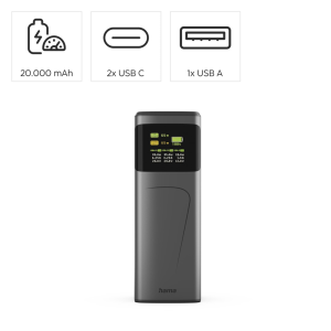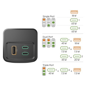 Poznámka: Powerbanka má celkový výstupní výkon max. 65 W. Připojíte-li dvě zařízení k oběma USB-C zásuvkám, výkon se rozdělí na 45 W a 20 W. Připojíte-li zařízení ke všem třem zásuvkám, výkon se rozdělí na 45 W pro jednu USB-C zásuvku, 7,5 W pro druhou USB-C a 7,5 W pro USB-A zásuvku.