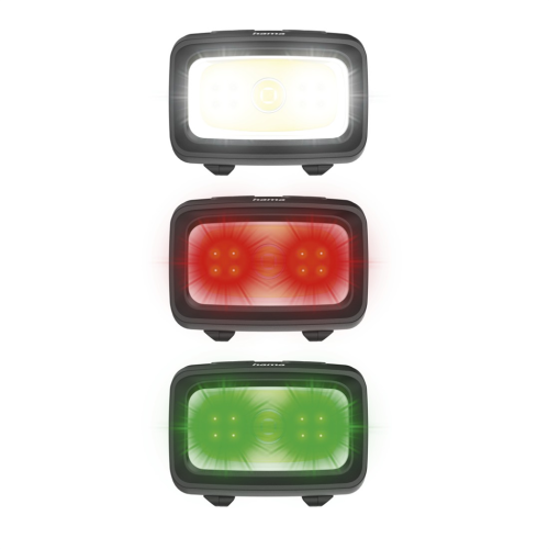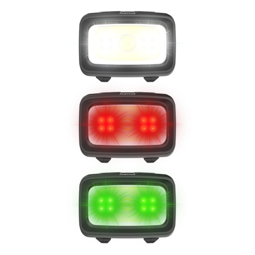 7 režimů svícení: bílá LED a COB LED s velmi silným světlem (350 lm / 60 m), se silným světlem (250 lm / 60 m), s tlumeným světlem (90 lm / 20 m) a blikáním (250 lm / 20 m), stejně tak červené a zelené světlo