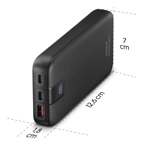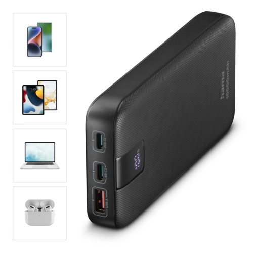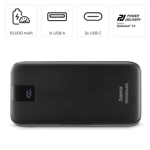 Hama PD 10 powerbanka, 10000 mAh, 3 výstupy: 2x USB-C, 1x USB-A, LED displej, PD, Qualcomm