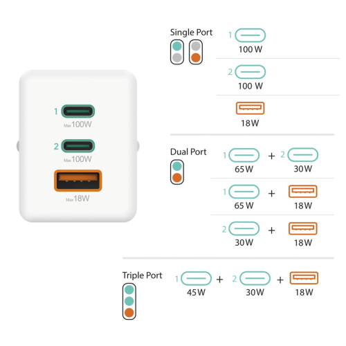 • současný výstup USB C1+C2+A: max. 45+30+18 W