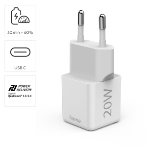 Hama rychlá USB nabíječka, USB-C PD/QC 20 W, super-mini