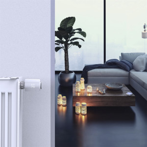 termostatická regulační hlavice pro radiátor s nastavitelnými vytápěcími programy pro časovou regulaci teploty v místnosti s možností vzdáleného ovládání mobilní aplikací (přes centrální jednotku)