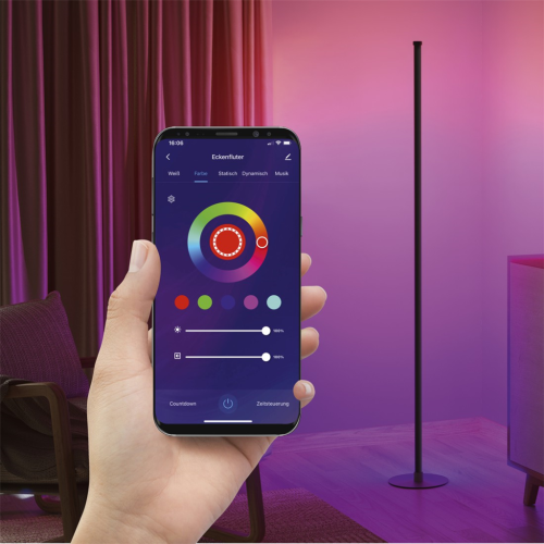 - objevte kouzlo světla se stojací lampou a vytvořte si osvětlení místnosti podle vašich představ - nastavte si osvětlení ve svých oblíbených barvách, měnící se barvy, blikání, efekt plamene, tlumené …