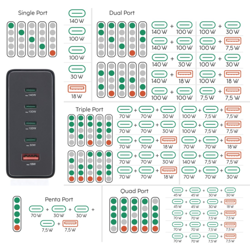 • výkon až 140 W pro jedno zařízení umožňuje nabíjet i náročné notebooky s napájením USB PD