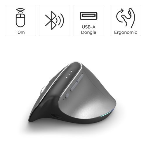- 8tlačítková ergonomická bezdrátová optická myš s volitelným připojením na tři zařízení: 1x bezdrátový USB přijímač a 2xBluetooth - vertikální provedení předchází namožní šlach a svalů a bolesti ramen …