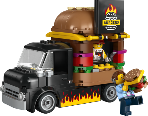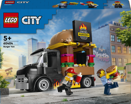Stavebnice LEGO® City (60404) Hamburgerový truck rozproudí fantazii malých stavitelů od 5 let. Střechu pojízdné prodejny hamburgerů zdobí obří burger a propracovaný prostor na přípravu jídla s řadou omáček a dochucovadel lze vyjmout. Zvedněte dvířka a odhalte ceduli s burgerem grilovaným na ohni. Součástí stavebnice je také minifigurka prodejce a zákazníka s naslouchátkem.