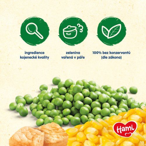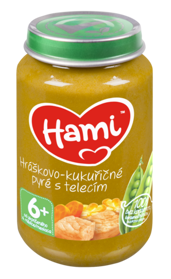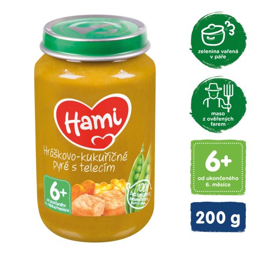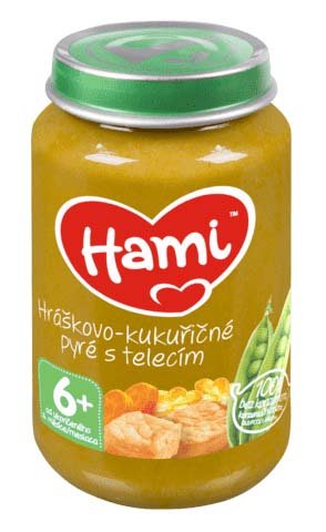 Hami Hráškovo-kukuřičné pyré s telecím je příkrm v praktickém balení vyrobený z nejkvalitnější zeleniny, která si díky zpracování v páře uchovává vitamíny a minerály, a masa dodávaného z ověřených farem. Neobsahuje přidanou sůl, díky čemu si zachovává přirozenou chuť a je 100% bez konzervantů a barviv. Děti si zamilují lahodnou chuť příkrmu a maminky ocení jednoduchost použití.