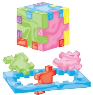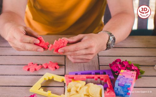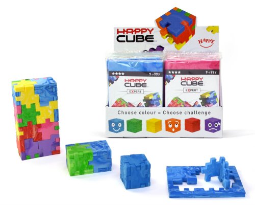 Prudce zábavné a návykové - tak by šlo charakterizovat pěnové 3D puzzle s názvem Happy Cube® (Veselá kostka). Procvičte si mozek a pusťte se do úžasného světa Happy Cube s různými stupni obtížnosti. Pořádejte turnaje s přáteli nebo s rodinou a skvěle se bavte! Skládání 3D puzzle kostky Happy Cube Vám provětrá mozkové závity, zlepšuje koncentraci, rozvíjí prostorové myšlení, koordinaci a snižuje stres. Základním úkolem je sestavit dokonalou kostku z šesti stejně barevných dílů. Není to ovšem tak jednoduché, jak by se na první pohled mohlo zdát. Obvykle existuje pouze jediný způsob, jak kostku složit. Dalším úkolem je naskládat jednotlivé dílky Happy Cube zpět do dvojrozměrného rámu, ve kterém byly dodány. Třetím úkolem a opravdovou výzvou je pak složit větší a složitější trojrozměrnou sestavu přidáním dalších druhů kostek stejné skupiny. Některé struktury jsou těžší než ostatní a jejich příklady naleznete na obalu každého výrobku Happy Cube. K dispozici jsou čtyři skupiny 3D puzzle kostek Happy Cube, z nichž každá obsahuje 6 různých kostek. Každá skupina má unikátní barevnou strukturu, styl a úroveň obtížnosti. V rámci každé skupiny jsou kostky a tedy i obtížnost rozlišeny podle barev. K dispozici je tedy celkem 24 různých kostek. Čtyři skupiny kostek Happy Cube: