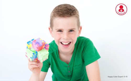 Věkově ohraničená obtížnost je pouze orientační, s kostkami určenými pro děti zažijí zábavu i dospělí. S tímto geniálním a zároveň jednoduchým nápadem přišel v roce 1986 belgický vynálezce Dirk Laureyssens. Kostky Happy Cube jsou vyrobeny z 8mm silné EVA pěny. Jsou dodávány v plochém dvojrozměrném provedení, umístěny do pěnového rámečku ve tvaru obdélníku. Lze prát v pračce na 30°. Rozměr složeného puzzle cca 4 x 4 x 4 cm