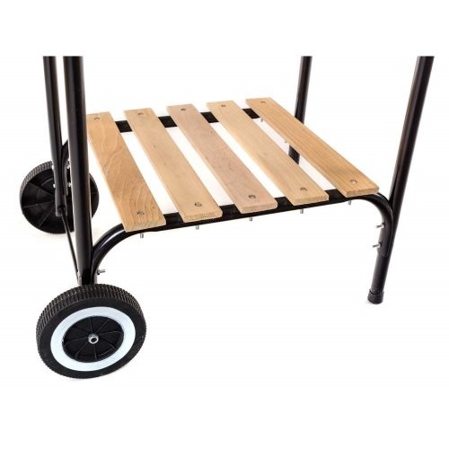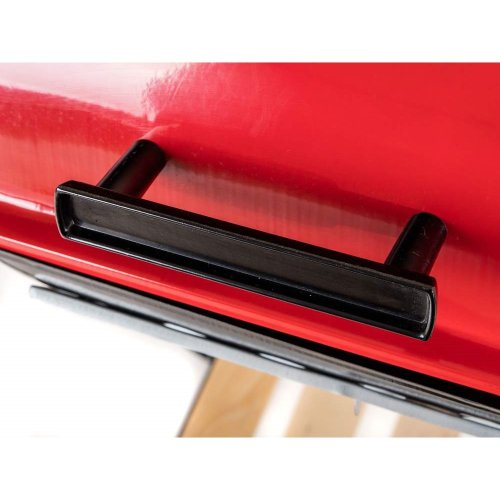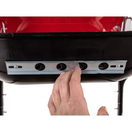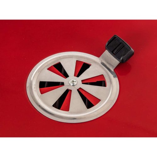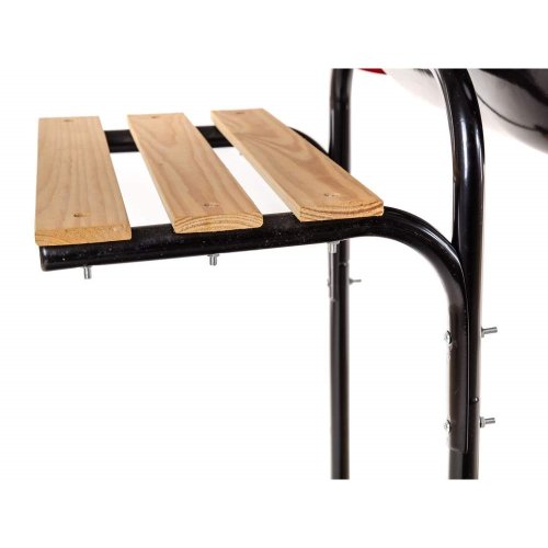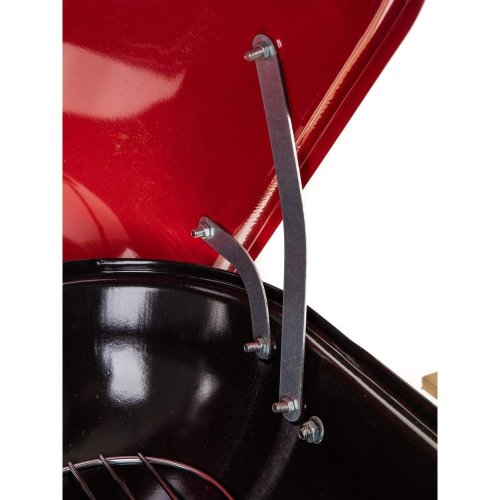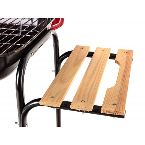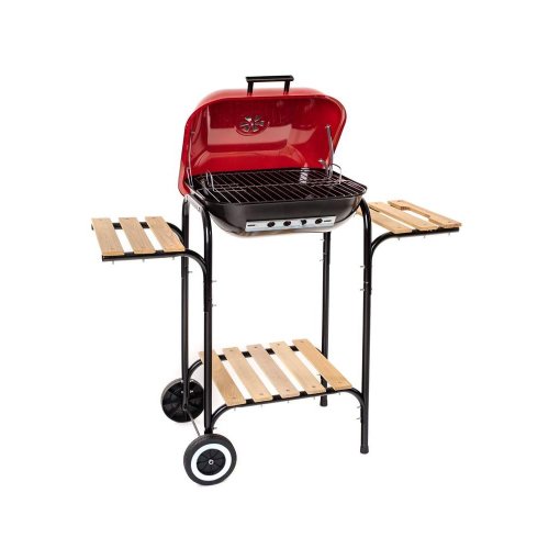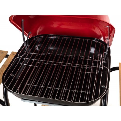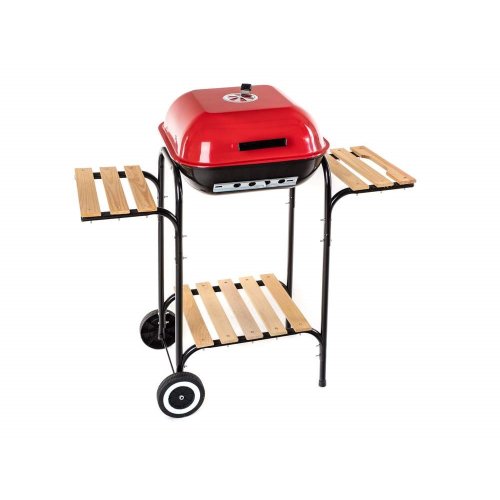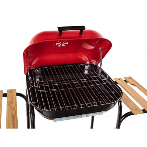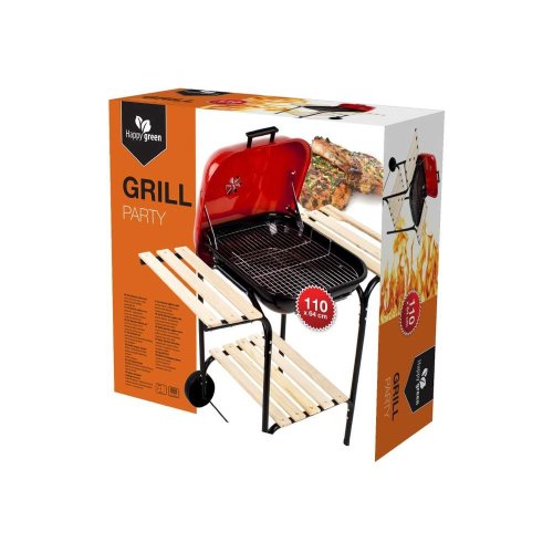 Velký PARTY gril je vybaven dřevěnými odkládacími policemi a pojezdovými koly. Povrch ohniště je smalt, povrch víka prášková červená barva. Gril je bez možnosti nastavení výšky roštu a na základě toho je grilovací plocha velice stabilní. Rozměry: ohniště 45 x 45 cm, tloušťka stěny ohniště 0,6 mm, víka 0,4 mm.