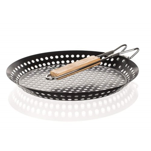 Grilovací pánev 31 x 3,5cm je ideální ke grilování ryb, masa a zeleniny. Je vyrobena z ušlechtilé oceli. Díky nepřilnavému povrchu se grilované potraviny z pánve snadno vyjímají. Praktická je sklápěcí dřevěná rukojeť s kovovým rámem a závěsným očkem. Specifická konstrukce pánve s otvory zajistí rovnoměrné grilovaní potravin a pomohou rozvinout vůně typické pro grilování.