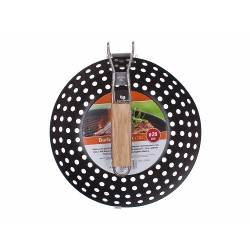 Grilovací pánev WOK 28 x 6,5 cm je opatřena otvory pro rovnoměrné grilování masa, ryb a zeleniny. Je vyrobena z ušlechtilé oceli a opatřena nepřilnavým povrchem, z kterého se potraviny snadno vyjímají. Praktická je sklápěcí dřevěná rukojeť s kovovým rámem a závěsným očkem. Specifická konstrukce pánve s otvory zajistí rovnoměrné grilovaní potravin a pomohou rozvinout vůně typické pro grilování.