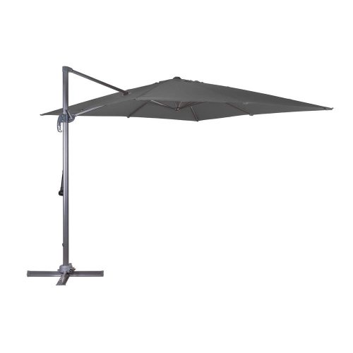 Závěsný slunečník TUCSON čtvercový 3 x 3 m má 8 ocelových žeber 12 x 18 mm, je vyrobený z polyesteru 180g / m2. Pevná hliníková tyč má průřez 50 x 67 mm. Stojan (součástí výrobku) je možno zatížit betonovými dlaždicemi pro zvýšení celkové stability. Otevírání slunečníku se provádí kličkou. Slunečník je možno otáčet kolem osy a naklápět. Barva šedá / ocelová tyč černá.