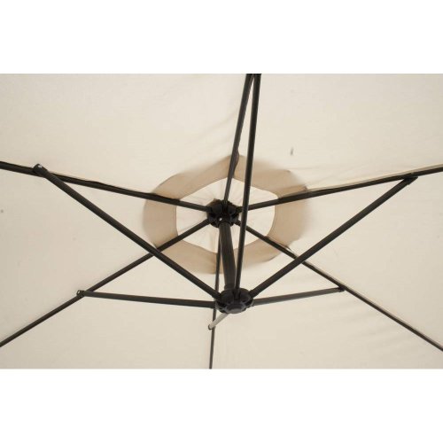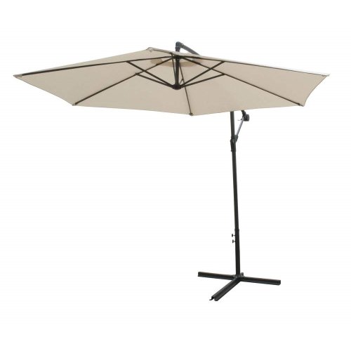 Závěsný slunečník průměr 300 cm má 6 ocelových žeber 12 x 18 mm, je vyrobený z polyesteru 160 g / m2. Pevná ocelová tyč má průměr 4,8 cm. Stojan, který je součástí výrobku je možno zatížit betonovými dlaždicemi pro zvýšení celkové stability. Otevírání slunečníku se provádí kličkou. Navíjecí systém má plastové pouzdro s kovovým navíjecím mechanismem - kovová klička, kovová hřídel a kovový pastorek s kovovou závlačkou. Barva béžová.