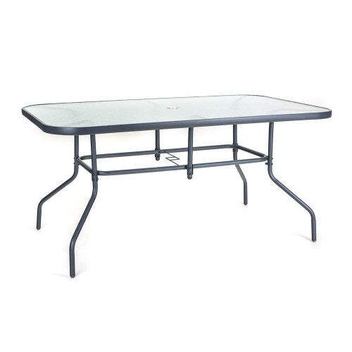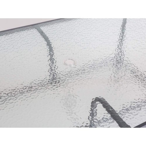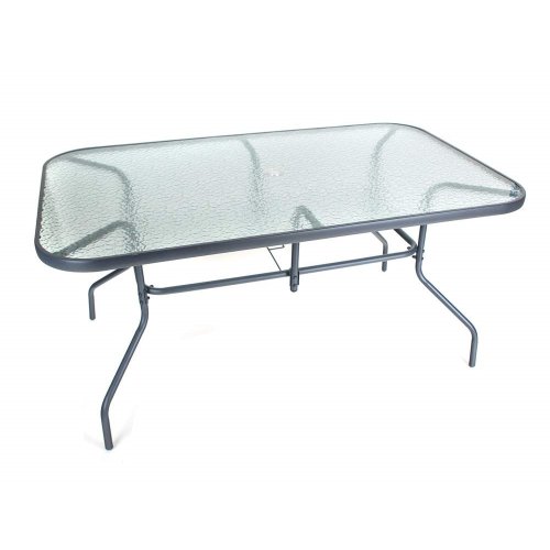 Ocelový zahradní stůl se hodí zejména do zahrad a na terasy domů. Stůl je ošetřený tepelně stabilizovanou práškovou barvou. Desku stolu tvoří temperované čiré sklo s vlnitým dekorem o síle 5mm. Vrchní deska je doplněna průchodkou pro umístění slunečníku, který musí být pevně fixován k podkladu. Nosnost je 70 kg.