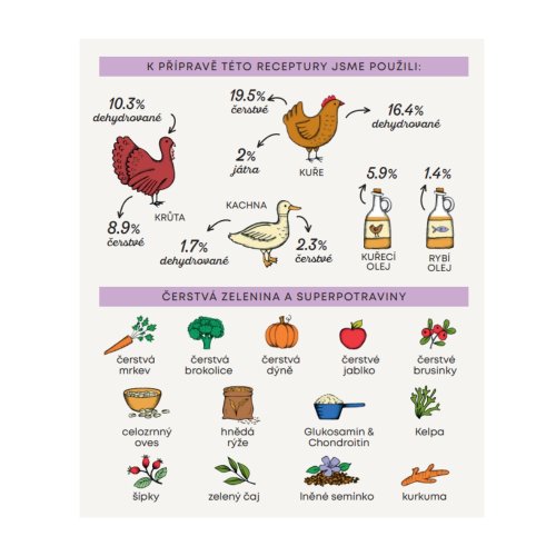Složení: dehydrované kuřecí 16,4 %, čerstvé vykostěné kuřecí 15,6 %, extrudovaná rýže, dehydrovaná krůta 10,3 %, celý zelený hrášek, kuřecí olej (chráněno přírodními tokoferoly) 5,9 %, čerstvá krůtí játra 5 %, čerstvá vykostěná krůta 3,9 %, čerstvá kuřecí játra 3,9 %, celozrnný oves 3,9 %, čerstvá vykostěná kachna 2,3 %, hydrolyzát z kuřecích jater 2 %, dehydrovaná kachna 1,7 %, rybí olej (chráněno přírodními tokoferoly) 1,4 %, jablečná vláknina, celozrnná rýže 1 %, lněné semínko (přírodní zdroj mastných kyselin ω3) 0,5 %, řepné řízky, kvasnice (Saccharomyces cerevisiae), minerální látky, čerstvá brokolice 1000 mg/kg, čerstvá dýně 1000 mg/kg, čerstvá mrkev 1000 mg/kg, čerstvá jablka 1000 mg/kg, hydrolyzovaná buněčná stěna kvasnic (zdroj MOS) 1000 mg/kg, čekanka (zdroj FOS) 1000 mg/ kg, glukosamin 500 mg/kg, výtažek z mandarinky 500 mg/kg, chondroitin 300 mg/kg, Yucca schidigera 200 mg/kg, Řasa Kelpa 30 mg/kg, klikva celé plody 30 mg/kg, šípky (bohaté na vitamín C) 30 mg/kg, zelený čaj 30 mg/kg, kurkuma 30 mg/kg.