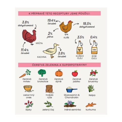 Složení: dehydrované kuřecí 18,5 %, čerstvé vykostěné kuřecí 15,6 %, celý zelený hrášek, čerstvá krůtí játra 7,6 %, jablečná vláknina, celozrnná rýže 6,5 %, celozrnný ječmen 5,7 %, čerstvá vykostěná kachna 3,8 %, čerstvá vykostěná krůta 3,8 %, čerstvá kuřecí játra 3,8 %, dehydrovaná krůta 3,8 %, kuřecí olej (chráněno přírodními tokoferoly) 3,5 %, rýžový protein, hydrolyzát z kuřecích jater 2 %, celozrnný oves 1,1 %, lněné semínko (přírodní zdroj mastných kyselin ω3) 0,7 %, řepné řízky, rybí olej (chráněno přírodními tokoferoly) 0,4 %, kvasnice (Saccharomyces cerevisiae), minerální látky, čerstvá brokolice 1000 mg/kg, čerstvá dýně 1000 mg/kg, čerstvá mrkev 1000 mg/kg, čerstvá jablka 1000 mg/ kg, hydrolyzovaná buněčná stěna kvasnic (zdroj MOS) 1000 mg/kg, čekanka (zdroj FOS) 1000 mg/kg, glukosamin 500 mg/kg, výtažek z mandarinky 500 mg/ kg, chondroitin 300 mg/kg, Yucca schidigera 200 mg/kg, Řasa Kelpa 30 mg/kg, klikva celé plody 30 mg/kg, šípky (bohaté na vitamín C) 30 mg/kg, zelený čaj 30 mg/kg, kurkuma 30 mg/kg.