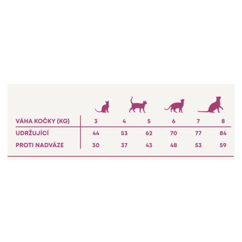 Krmný návod: změnu krmiva je třeba provádět postupně po dobu 7 dní. Jako návod použijte tabulku s dávkováním. Denní množství potravy se může pro každou kočku lišit, záleží na úrovni její aktivity, plemeni a podmínkách prostředí. Denní krmnou dávku podávejte rozdělenou na 2 porce denně, nepoužívejte zbytky krmiva z předchozího dne. Kočka musí mít vždy přístup k čisté, čerstvé vodě. Skladování: skladujte na chladném a suchém místě. Obal by měl být po použití vždy bezpečně uzavřen.