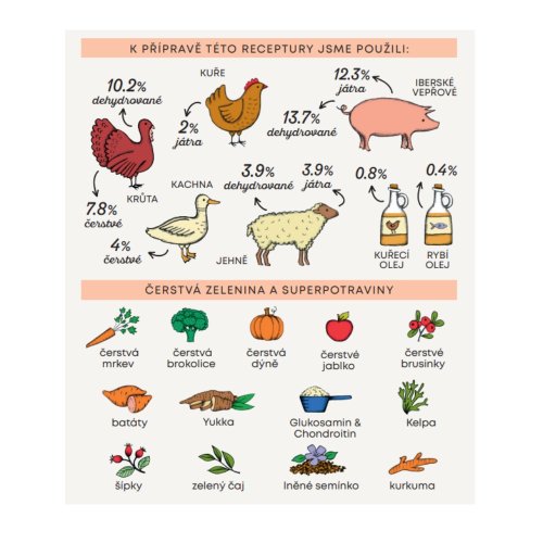 Složení: dehydrované iberské vepřové 13,7 %, čerstvé vykostěné vepřové 12,3 %, celý zelený hrášek, dehydrovaná krůta 10,2 %, dehydrované brambory, jablečná vláknina, čerstvá vykostěná kachna, řepné řízky, čerstvá jehněčí játra 3,9 %, čerstvá vykostěná krůta 3,9 %, dehydrované jehněčí 3,9 %, čerstvá krůtí játra 3,9 %, hydrolyzát z kuřecích jater 2 %, lněné semínko (přírodní zdroj mastných kyselin ω3) 1,1 %, kuřecí olej (chráněno přírodními tokoferoly) 0,8 %, kvasnice (Saccharomyces cerevisiae), rybí olej (chráněno přírodními tokoferoly) 0,4 %, minerální látky, čerstvá brokolice 1000 mg/kg, čerstvá dýně 1000 mg/kg, čerstvá mrkev 1000 mg/kg, čerstvá jablka 1000 mg/kg, hydrolyzovaná buněčná stěna kvasnic (zdroj MOS) 1000 mg/kg, čekanka (zdroj FOS) 1000 mg/kg, glukosamin 500 mg/kg, výtažek z mandarinky 500 mg/kg, chondroitin 300 mg/kg, Yucca schidigera 200 mg/kg, Řasa Kelpa 30 mg/kg, klikva celé plody 30 mg/kg, šípky (bohaté na vitamín C) 30 mg/kg, zelený čaj 30 mg/kg, kurkuma 30 mg/kg.