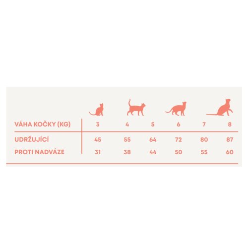 Krmný návod: změnu krmiva je třeba provádět postupně po dobu 7 dní. Jako návod použijte tabulku s dávkováním. Denní množství potravy se může pro každou kočku lišit, záleží na úrovni její aktivity, plemeni a podmínkách prostředí. Denní krmnou dávku podávejte rozdělenou na 2 porce denně, nepoužívejte zbytky krmiva z předchozího dne. Kočka musí mít vždy přístup k čisté, čerstvé vodě. Skladování: skladujte na chladném a suchém místě. Obal by měl být po použití vždy bezpečně uzavřen.