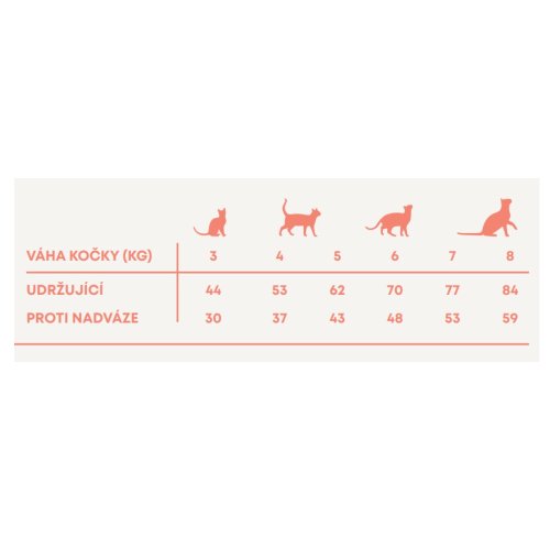 Krmný návod: změnu krmiva je třeba provádět postupně po dobu 7 dní. Jako návod použijte tabulku s dávkováním. Denní množství potravy se může pro každou kočku lišit, záleží na úrovni její aktivity, plemeni a podmínkách prostředí. Denní krmnou dávku podávejte rozdělenou na 2 porce denně, nepoužívejte zbytky krmiva z předchozího dne. Kočka musí mít vždy přístup k čisté, čerstvé vodě.