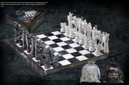 Kouzelnické šachy, se kterými jste se mohli setkat hned v prvním díle Harry Potter a Kámen mudrců. Jedná se o set hrací desky s plastovými figurkami. Velikost figurek od 5 do 12 centimetrů. Rozměr hrací desky 47x47 cm. Hmotnost setu: 1,7 kg Oficiální licence Harry Potter Výrobce: britská společnost Noble Collection
