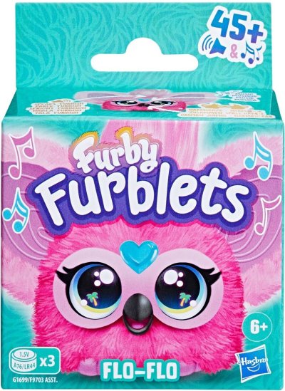 Furblet Flo-Flo hraje veselou hudbu. Více než 45 zvukových reakcí: Furblets mluví jazykem Furbish, vydávají legrační zvuky a zpívají originální melodie. Dokážou harmonizovat, společně zpívají písně a společně interagují s velkou hračkou Furby. Díky odnímatelnému klipu lze Furblet snadno připnout na batoh nebo tašku. Pro provoz jsou potřeba 3ks baterie typu LR44 (jsou součástí balení).