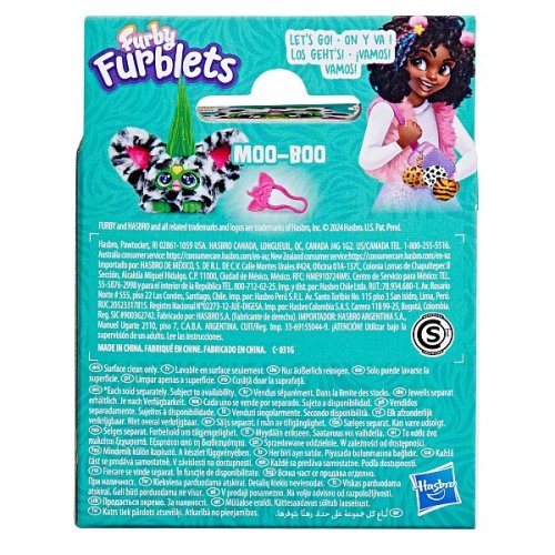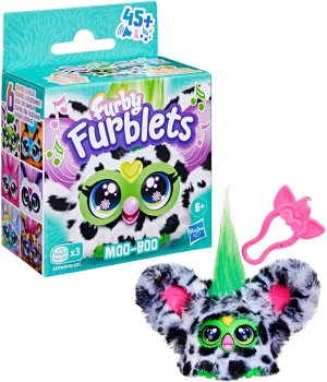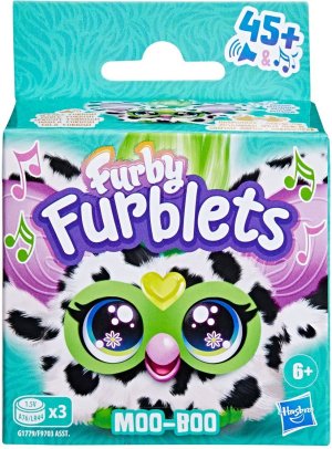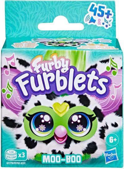 Furblet Moo-Boo hraje veselou hudbu. Více než 45 zvukových reakcí: Furblets mluví jazykem Furbish, vydávají legrační zvuky a zpívají originální melodie. Dokážou harmonizovat, společně zpívají písně a společně interagují s velkou hračkou Furby. Díky odnímatelnému klipu lze Furblet snadno připnout na batoh nebo tašku. Pro provoz jsou potřeba 3ks baterie typu LR44 (jsou součástí balení).