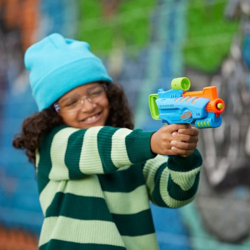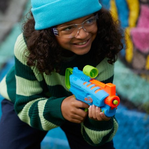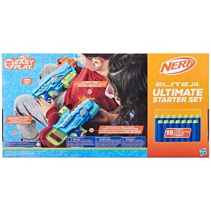 Nerf Elite Junior jsou blastry vytvořené pro hráče, kteří teprve poznávají značku Nerf. Unikátní vlastnosti blastrů dělají hru ještě jednodušší a používání těchto hraček není pro mladší děti žádným problémem, nyní mohou sami začít hrát. Velikost a váha blastrů byly přizpůsobeny tak, aby pohodlně padly do malých rukou. Nabíjení šipek zepředu bez složitých systémů je rychlé a jednoduché. Pro nabití blastru stačí táhnout za ergonomickou a širší rukojeť, což nevyžaduje velkou sílu. Díky tomu mohou děti s blastry Nerf Elite Junior hrát s jistotou a samostatně projít všemi kroky přípravy, užívat si radost ze hry. V Nerf Elite Junior Ultimate Starter Setu jsou 2 snadno ovladatelné blastry a 15 šipek NERF Elite. První zbraň je dvouhlavňová a vystřelí tak dvě šipky po sobě. Druhá vystřeluje jednu šipku. Dobíjení u obou ovšem v mžiku zvládnete. Obě zbraně Nerf Elite Junior Ultimate jsou vyrobeny z kvalitního plastu. Při hraní je doporučeno, aby děti použily bezpečnostní brýle (nejsou součástí). Rozměr balení: 28,57 x 55,88 x 6,66 cm. Vhodné od 6 let.