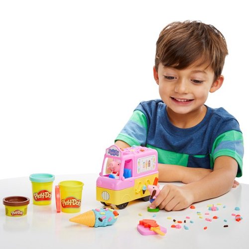 Prasátko Peppa si prostě zmrzlinu neodpustí! Kroky letní zábavy nepochybně povedou směrem Play-Doh pochoutek na osvěžení. Se zmrzlinářským vozem si užijete spoustu legrace. Najdete v něm vyměnitelné formičky na výrobu Play-Doh nanuků, kornoutů a dalších pamlsků. Kdo by se netěšil na figurku Peppy, která má zespodu razítko a může jezdit v autě! Vzhled řady Play-Doh a Peppy se spojuje a přináší fascinující zábavu. Prasátko Peppa s 5 kelímky, zmrzlinovým vozem a spoustou příslušenství. je také perfektní jako dárek. Modelína je lehce tvarovatelná a velice měkká. Nebarví, nešpiní a nevysychá. Věk: 3+