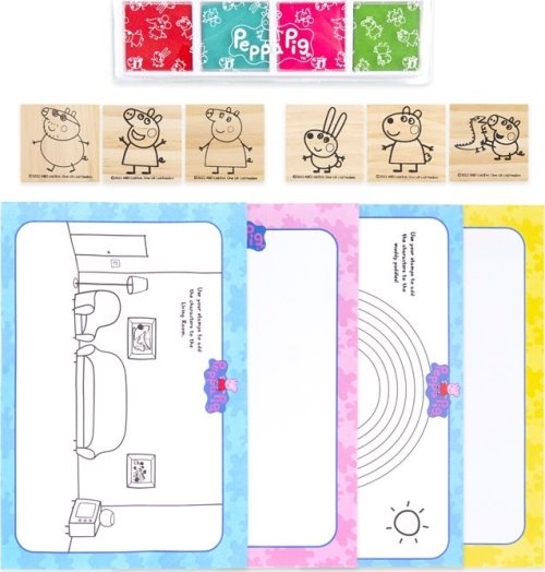Barevná zábava s dřevěnými razítky s motivem animovaného seriálu Prasátko Pepa.