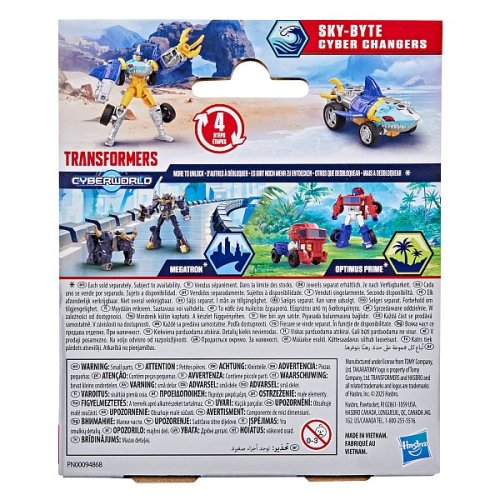 Transformers Cyberworld - Cyber Changers přináší roboty v přestrojení do zcela nové úrovně boje! Staří známí – oblíbené postavy, Autoboti a Decepticoni, kteří možná vypadají trochu povědomě, se vracejí do akce. Akční figurka Sky-Byte se snadno promění z robota na alternativní mód žraloka ve 4 krocích. Přeměna ve 4 krocích je dostatečně jednoduchá, aby ji děti zvládly samy. V režimu robota je figurka vysoká přibližně 10 cm a je polohovatelná. Vyrobeno z kvalitního plastu. Rozměry balení: 15,08 x 12,7 x 4,9 cm. Věk: 6+