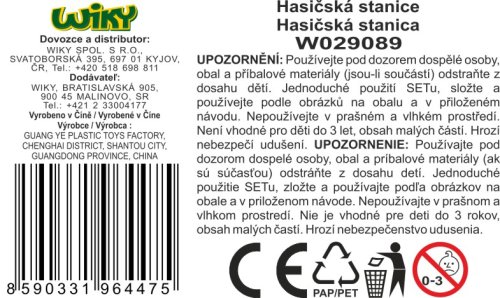 Hasičská stanice. Rozměry 37x17,5x21 cm. Součástí dvě auta. Volná kola. Manuální výtah, otevírací dveře. Nálepky a obrázkový návod na složení součástí balení.