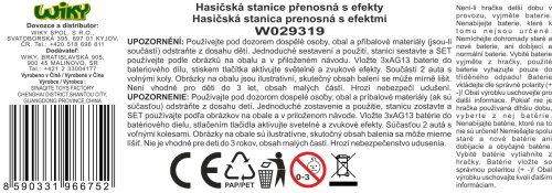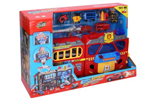 Hasičská stanice přenosná. Rozměry 56x18x23 cm. Světelné a zvukové efekty. Aktivace tlačítkem na modrém panelu. 3xAG13 baterie součástí. Součástí 2 auta s volnými koly, mnoho příslušenství (dopravní značky, hasičský přístroj, myčka, čerpací stanice, diagnostika a další).