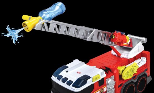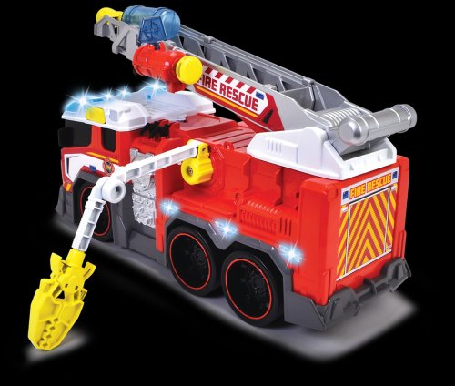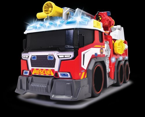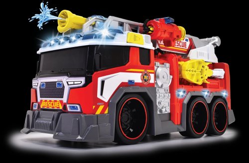 Hasičské auto na volnoběh, světelná a zvuková funkce, funkční stříkačka na vodu, výsuvný žebřík, mechanická ruka, vystřelovací kotva. Délka 37 cm.